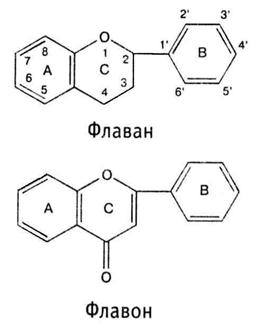 Флавоноидами называется многочисленная группа природных биологически активных соединений, в основе структуры которых лежит скелет, состоящий из двух бензольных колец (А и В), соединенных между собой трехуглеродной цепочкой (пропановый мостик) – С6-С3-С6. Посредством пропанового мостика в большинстве флавоноидов образуется гетероцикл, являющийся производным пирана или гамма -пирона с атомом кислорода в кольце. Значительное количество флавоноидов можно рассматривать как производные 2-фенилхромана (флавана) или 2-фенилхромона (флавона).