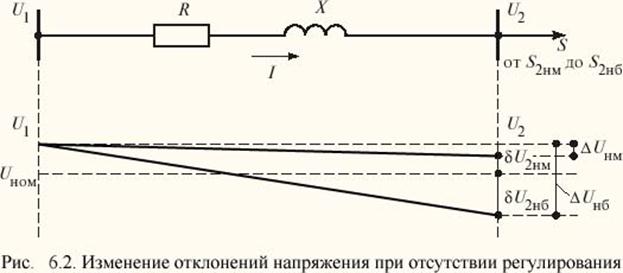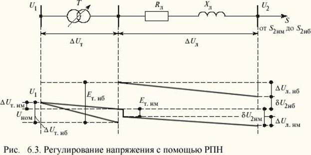 Обеспечение требований по допустимым отклонениям напряжения в каждой точке сети без специальных регулирующих устройств возможно только тогда, когда суммарные потери напряжения относительно невелики. Такие условия могут быть в сетях относительно небольшой протяженности с малым числом промежуточных трансформаций и небольшой нагрузкой. Современные ЭЭС характеризуются большой протяженностью линий различных номинальных напряжений и многоступенчатой трансформацией. Поэтому передача электроэнергии от ее источников до приемников, когда суммарные потери напряжения велики, невозможна без специальных средств регулирования напряжения. В распределительных электрических сетях отклонения напряжения обычно определяются в характерных точках. Это — точки, удаленные от центров питания (ЦП), оборудованных трансформаторами с регулируемым под нагрузкой коэффициентом трансформации (РПН). Суточный диапазон изменения нагрузки потребителя достаточно велик, что приводит к изменению потерь напряжения в сети, а следовательно, и к изменению отклонений напряжения в узлах. Такой пример приведен на рис. 6.2, когда напряжение в начале линии U 1 поддерживается на уровне выше номинального, а мощность нагрузки изменяется в диапазоне от S 2 нм до S 2 нб. В этом примере напряжение U 2 на приемном конце ниже тогда, когда нагрузка больше. При этом отклонения напряжения от номинального значения в режиме наибольшей (d U 2 нб) и наименьшей (d U 2 нм) нагрузки могут отличаться от допустимых значений. В Правилах устройства электроустановок рекомендуется поддерживать напряжение в ЦП на уровне не ниже 105 % номинального в режиме наибольшей нагрузки и не выше 100 % — в режиме наименьшей нагрузки. Это требование отвечает принципу встречного регулирования напряжения. Для реализации используются средства регулирования напряжения. На рис. 16.3 в качестве этого средства используется трансформатор с РПН. Регулятор РПН в зависимости от тока I нагрузки трансформатора изменяет его коэффициент трансформации К т, вводя ту или иную добавку напряжения Е т так, что с увеличением тока К т снижается и напряжение на стороне отходящей линии повышается. И, наоборот, при снижении тока нагрузки К т увеличивается и напряжение снижается. Теперь напряжение в режиме наибольшей нагрузки выше U ном(d U 2 нб — положительно), а в режиме наименьшей — ниже (d U 2 нм — отрицательно).
