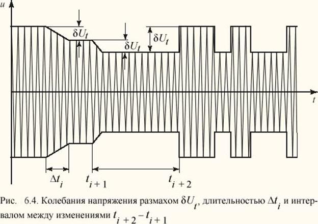 Коэффициент трансформации изменяется так, что при промежуточных нагрузках d U 2 нм < d U пр < d U 2 нб. Энергоснабжающая организация может задавать часы наибольшей и наименьшей нагрузки определенными интервалами времени в течение суток. В течение этих интервалов нагрузка потребителя может изменяться, оставаясь соответственно в диапазонах наибольших или наименьших значений. Поэтому и допустимые отклонения напряжения должны задаваться диапазонами отдельно для режимов наибольшей и наименьшей нагрузки и поддерживаться в заданных диапазонах средствами регулирования напряжения. Колебания напряжения. Если отклонения напряжения создаются под воздействием относительно медленных изменений нагрузки, определяемых ее графиком, то быстрые изменения нагрузки создают колебания напряжения. Колебания напряжения определяются по огибающей действующих или амплитудных значений напряжения и характеризуются размахами d U t и частотой повторения изменений напряжения