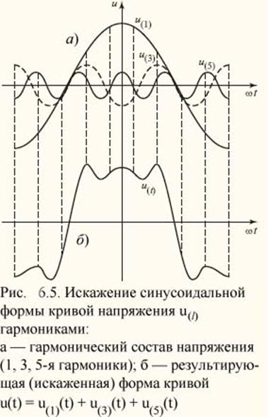 Несинусоидальность напряжения. Значительную долю нагрузки в электрической сети представляют ЭП с нелинейной вольт-амперной характеристикой. Такие ЭП потребляют ток, форма которого существенно отличается от синусоидальной. Пример искажения синусоидальной формы кривой и ее гармонических составляющих приведен на рис. 6.5.