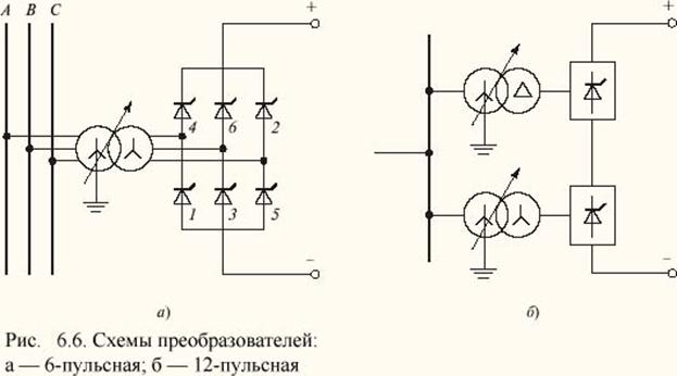 Эти токи, протекая по элементам сети (линии, трансформаторы), создают на них падение напряжения. В результате напряжение в точке присоединения преобразователя (рис. 16.6) отличается от напряжения источника питания. Причем эти падения напряжения устанавливаются для каждой гармоники в отдельности так, что, суммируясь, они обусловливают несинусоидальные напряжения в указанной точке, где