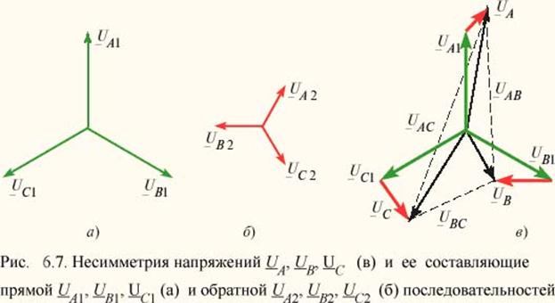 Для характеристики несимметрии напряжений (токов) используют метод симметричных составляющих. Согласно этому методу несимметричная трехфазная система может быть представлена в виде трех симметричных, образующих прямую U A 1, U B 1, U C 1, обратную U A 2, U B 2, U C 2 и нулевую U A 0, U B 0, U C 0 последовательности. Так, например, для фазы А каждая из указанных последовательностей определяется из выражений: