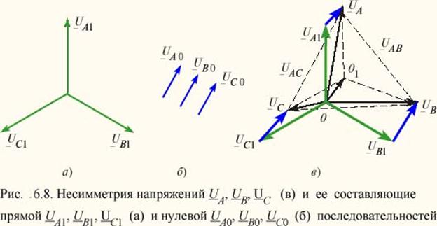 где U A, U B, U C — несимметричные фазные напряжения. На рис. 6.7 приведена векторная диаграмма несимметричной системы и ее симметричные составляющие прямой и обратной последовательностей. Заметим, что напряжение нулевой последовательности U 0 (рис. 6.8) представляет напряжение смещения нейтрали. Его можно наблюдать в четырехпроводных системах электроснабжения, для которых обмотки питающих трансформаторов и фазы нагрузки соединены в «звезду». Образовавшиеся таким образом нейтрали объединены нулевым проводом. При этом междуфазные напряжения могут оставаться симметричными. Обрыв нулевого провода в такой сети приводит к перенапряжениям на зажимах однофазных электроприемников.