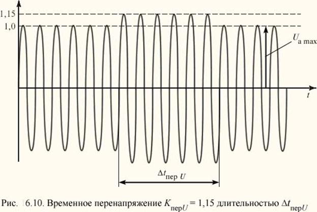 На рис. 6.10 приведена форма периодического перенапряжения в общем случае. Перенапряжения представляют опасность для людей и электрооборудования, особенно если это явление длительно. Длительные перенапряжения возникают в электрических сетях с компенсированной для ограничения токов КЗ на землю нейтралью, в сетях с высокой емкостной проводимостью, четырехпроводных сетях при обрывах нейтрального провода. В сетях с изолированной нейтралью (10 и 35 кВ) допускается длительная работа при однофазном КЗ на землю. Однако при этом напряжение неповрежденных фаз по отношению к земле может возрасти до междуфазного значения. Аналогичные условия возникают в четырехпроводных сетях 380 В при обрыве нейтрали. В протяженных линиях электропередачи 500, 750 кВ перенапряжения возникают в результате их разгрузки по передаваемой мощности за счет избыточной реактивной мощности, генерируемой такими линиями. Для характеристик КЭ по временным перенапряжениям применяют два параметра. Коэффициент временного перенапряжения рассчитывается по формуле, отн. ед.: