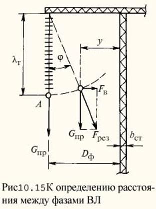 При использовании на ВЛ как подвесных гирлянд стеклянных и фарфоровых изоляторов, так и стержневых полимерных изоляторов расстояние от провода до стойки опоры у определяется с учетом возможного отклонения провода под давлением ветра (рис. 10.15) на угол φ, зависящий от соотношения удельных нагрузок — вертикальной от собственной массы провода без гололеда G пр и горизонтальной от действия ветра F в, которые формируют результирующий вектор силы F рез, действующей на провод. При этом минимально допустимое расстояние между фазой линии и стойкой опоры