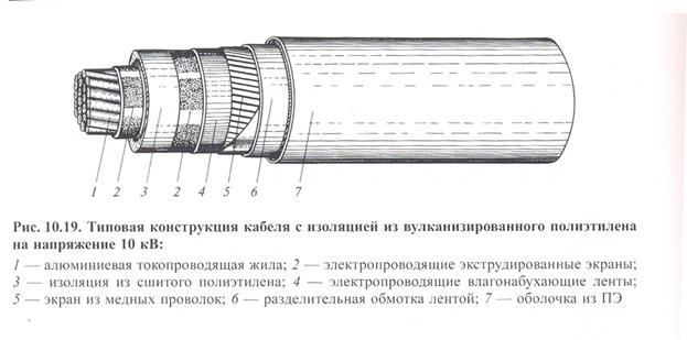 Трех- и четырехжильные кабели имеют круглые или секторные жилы. Так же, как и в кабелях с бумажной пропитанной изоляцией, в их конструкциях имеется слой обшей (поясной) изоляции. Она выпрессовывается в виде шланга из ПВХ либо наматывается лентами из того же материала или полиэтилентерефталатной пленки и бумаги. Толщина фазной изоляции из сшитого полиэтилена в одножильных кабелях 10 и 35 кВ составляет 4 и 9 мм соответственно.
