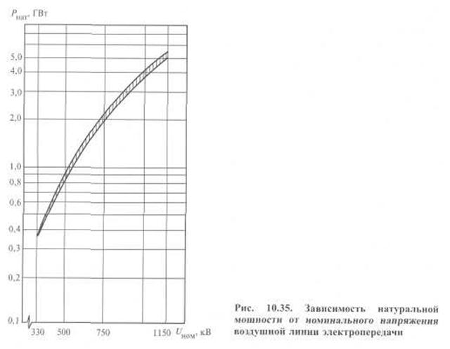 В силу относительно незначительного влияния r0ф и g0 волновые параметры и натуральная мощность ВЛ с расщепленной фазой (330—1150 кВ) имеют слабо выраженную зависимость от сечения провода, причем тем меньшую, чем выше номинальное напряжение и число проводов в фазе. Среднее значение модуля волнового сопротивления для линий 330 кВ составляет примерно 307 Ом, для линий 500 и 750 кВ с п = 4 — 288 Ом, для линий 750 кВ с п = 5 — 272 Ома, для линий 1150кВ с п = 8 и п =10 — 257 и 242 Ома соответственно. Уменьшение модуля волнового сопротивления с ростом (Uном и n по сравнению с линиями с нерасщепленной фазой происходит примерно в той же степени, что и изменения х0 и bо, отношение которых в основном определяет величину ZВ. Аргумент волнового сопротивления ВЛ 330—1150 кВ отрицателен и не превышает -5°, уменьшаясь с ростом Uном и n до -0,7°. Это в свою очередь означает, что с достаточной для практики точностью волновое сопротивление можно считать вещественным числом. Аналогично коэффициент затухания а, определяющий отличие γ от чисто мнимой величины, лежит в пределах 9,7— 1,6 % от соответствующих значений β, уменьшаясь с ростом Uном и n, что позволяет с достаточной для практики точностью оценивать модуль у лишь по значению коэффициента изменения фазы. Последний для линий 330 и 500 кВ составляет примерно 1,06∙10-31/км, а для линий 750 и 1150 кВ близок к 1,05∙10-3 1/км. Изменение натуральной мощности как функции Uном показано на рис. 10.35, где верхняя и нижняя границы заштрихованной зоны соответствуют максимальному и минимальному сечениям из применяемого при данном Uном диапазона. Являясь ориентировочным показателем пропускной способности линий длиной 1000—1500 км, т. е. линий класса напряжения 500 кВ и выше, она весьма слабо зависит от сечения провода и растет пропорционально квадрату номинального напряжения [см. формулу (10.8)]. В соответствии с указанными выше средними значениями модуля волнового сопротивления среднее значение натуральной мощности ВЛ 330 кВ составляет примерно 355 МВт, 500 кВ — 868 МВт, 750 кВ с п = 4 и п = 5 — соответственно 1954 и 2068 МВт, 1150 кВ с п = 8 и п = 10 — соответственно 5146 и 5468 МВт. Таким образом, увеличение напряжения примерно в 10 раз (со 11О до 1150 кВ) наряду с увеличением числа проводов в фазе с 1 до 10 позволяет увеличить натуральную мощность (а следовательно, и пропускную способность) ВЛ с 28 до 5468 МВт, т. е. почти в 200 раз.