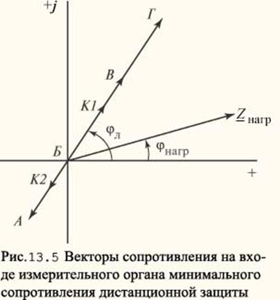 Так как Z уд — величина постоянная, защита реагирует на расстояние до места короткого замыкания, что и обусловило ее название. Сопротивление на входе измерительного органа защиты представляет собой комплексную величину. Сопротивление на входе защиты (например, защиты 3 на рис. 13.4) в комплексной плоскости при коротком замыкании в точке К1 есть вектор БК1 (рис. 13.5), сопротивление линии БВ и суммарное сопротивление линий БВ и ВГ — векторы БВ и БГ, а сопротивление до точки К2 и линии АБ — векторы БК2 и БА. Угол наклона φл этих векторов сопротивления определяется активным и реактивным сопротивлением защищаемых линий. Сопротивление на входе защиты в рабочем режиме работы электрической сети отображается вектором сопротивления нагрузки, получающей питание по защищаемой линии (Z нагр на рис. 13.5). Этот вектор отличается от вектора сопротивления короткого замыкания не только по величине, но и по фазе, так как коэффициент мощности нагрузки cosφнагр = 0,8—0,95. С целью повышения чувствительности защиты, т.е. наилучшей отстройки защиты как от внешних коротких замыканий, так и от режима нагрузки, используются реле минимального сопротивления с различными характеристиками срабатывания (рис. 13.6).