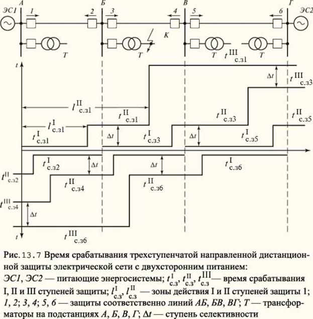 Характеристики на рис. 13,6, а и б имеют соответственно ненаправленное и направленное реле полного сопротивления. Угол максимальной чувствительности у направленного реле, соответствующий максимальному значению сопротивления срабатывания реле Z с.р max, равняется φл. Характеристика на рис. 13.6, в позволяет обеспечить чувствительность защиты при коротком замыкании через переходное сопротивление, а характеристика на рис. 13.6, г — оптимальным образом отстроить защиту от сопротивления нагрузки. Дистанционная защита выполняется, как правило, трехступенчатой. Первая ступень не имеет выдержки времени (рис. 13.7), а сопротивление срабатывания принимается несколько меньшим сопротивления защищаемой линии. Например, для защиты 1 линии АБ
