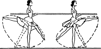 Это упражнение входит в экзерсис у палки. En dehors. Обыкновенно на уроке этому rond de jambe предшествует rond de jambe par terre, и в нем заключается импульс для дальнейшего сильного броска ноги. Нога из IV позиции сзади с вытянутыми пальцами сильно бросается вперед, проходит I позицию, взлетает вперед в полусогнутом положении на 45°, вытягивается, описывая круг через II позицию назад на высоте 90° вращением в бедренном суставе, и возвращается в IV позицию. Круг надо сделать возможно больший, нога как бы охватывает все доступное ей поле деятельности (рис. 24). Следует добиваться, чтобы нога работала совершенно самостоятельно, не вовлекая корпус в движение. Это достигается тогда, когда мускулы уже вполне окрепли и подчинены воле. При хорошем исполнении корпус остается спокойным, незаметно сильное напряжение всех мускулов, удерживающих его, нога же — в напряженной работе от бедра до носка. En dedans. Движение в обратном направлении. Надо следить, чтобы нога, пройдя из IV позиции впереди через I позицию, аккуратно попадала бы назад в полусогнутое положение, крепко захваченная в верхней части, и оттуда проходила бы, делая круг, через II позицию вперед на высоте 90°, что дает силу и больший охват всему совершаемому кругу. Необходимо, чтобы нога при начале выбрасывания точно приходилась против I позиции, не заходя вперед при исполнении en dehors и назад — при исполнении en dedans.