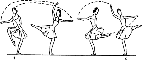 Рис. 119. Grand fouette en toumant При переходе ноги вперед руки проходят через подготовительное положение наверх, на III позицию, и заканчивают на arabesque (рис.119). En dehors. Поза croisee, левая нога назад, coupe, demi-plie на левой ноге, выбрасывая правую ногу на II позицию на 90°, поднявшись на полупальцы на левой, руки открыть на II позицию, бросить правую ногу по полу через I позицию на 3-й arabesque на demi-plie, проводя руки через подготовительное положение также на 3-й arabesque, и поворотом en dehors вывернуться на полупальцах на croise вперед на 90°, на demi-plie, придав рукам должную позу.[24] Grand fouette en tournant исполняется также и со II позиции, своим видом оно напоминает fouette на 45°, но проделывается в два приема. Его следует начинать за тактом, выбрасывая коротким движением ногу на II позицию на 90° на полупальцы, раскрыв руки также на II позицию, на 1-ю четверть — plie на опорной ноге, затем делают tour, проводя ногу сзади и впереди колена; заканчивают движение на 2-ю четверть на plie, нога впереди колена (одновременно руки соединяются в подготовительном положении). Как и toilette на 45°, это pas исполняется только на пальцах, без прыжка, и служит для женского исполнения. Grand fouette en tournant sante. Те же pas можно сделать в прыжке. Начинаем так же, после plie на левую ногу, правая нога выбрасывается на II позицию, левая отрывается от пола прыжком, в то время как правая бросается описанным приемом, поворот производится также в воздухе, на прыжке левой ноги.