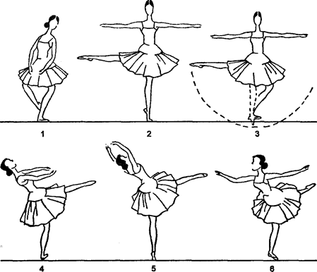 Рис. 118. Grand fouette Preparation — то же coupe. Раскинув руки на II позицию, пригнуть левую на I позицию, стать на левую ногу на полупальцы, demi-plie на левой ноге, поворот корпуса на efface, выводя правую ногу полусогнутой на efface на 45° вперед, пригнуть корпус к этой ноге, взяв правый бок в себя и выгнув левый; подняться на полупальцы, провести ногу через grand rond de jambe, во время прохождения поднимая ее на 90° и выше, повернув корпус на attitude effacee, одновременно левая рука поднимается на III позицию и открывается на II позицию, правая же рука идет наверх со II позиции в III позицию в позу effacse. Опуститься на demi-plie. Так проделываемое движение переведено в более пластичные, классические формы, тогда как итальянское fouette несколько сухо и схематично, без переходных поз, смягчающих croisee и effacee и т. д. En dedans. Правая нога полусогнута назад на efface 45°, и корпус изогнут к ноге, правая рука на I позиции, левая — открыта на II. Подняться на полупальцы левой ноги, проводя правой grand rond de jambe тем же приемом, который указан в grand fouette en dehors, выводя ногу на 90° и выше вперед на efface. Правая рука открывается на II позицию через подготовительное положение, левая идет наверх в III позицию. Опуститься на demi-plie на левой ноге. Эти движения можно проделывать и с прыжком, соблюдая те же правила. Grand fouette en tournant. En dedans. Этот вид более распространен, чем следующий en dehors. Стать в позу croisee вперед, левая нога впереди, опуститься на demi-plie на левую ногу, вскочить на нее на полупальцы и выбросить правую ногу на II позицию на 90° — grand battement jete. Руки вскинуть на II позицию. Опуститься на левую ногу на demi-plie, поворачиваясь, бросить размахом по полу правую ногу — battement вперед на 90° в направлении точки 6 (рис. 1, б), проводя ее близ опорной ноги, подняться на нее на полупальцы, перегнув корпус назад и довернуться en dedans, удерживая правую ногу на той же высоте, закончить движение на 3-й arabesque на demi-plie (можно закончить и на 1-й arabesque).