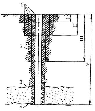 Бурение - это процесс сооружения скважины путем разрушения горных пород. Скважиной называют горную выработку круглого сечения, сооружаемую без доступа в нее людей, у которой длина во много раз больше диаметра. Верхняя часть скважины называется устьем, дно - забоем, боковая поверхность - стенкой, а пространство, ограниченное стенкой - стволом скважины. Длина скважины - это расстояние от устья до забоя по оси ствола, а глубина - проекция длины на вертикальную ось. Длина и глубина численно равны только для вертикальных скважин. Однако они не совпадают у наклонных и искривленных скважин. Элементы конструкции скважин приведены на рис. 6.1. Начальный участок I скважин называют направлением. Поскольку устье скважины лежит в зоне легкоразмываемых пород его необходимо укреплять. В связи с этим направление выполняют следующим образом. Сначала бурят шурф - колодец до глубины залегания устойчивых горных пород (4...8 м). Затем в него устанавливают трубу необходимой длины и диаметра, а пространство между стенками шурфа и трубой заполняют бутовым камнем и заливают цементным раствором 2. Нижерасположенные участки скважины - цилиндрические. Сразу за направлением бурится участок на глубину от 50 до 400 м диаметром до 900 мм. Этот участок скважины закрепляют обсадной трубой 1 (состоящей из свинченных стальных труб), которую называют кондуктором II. Затрубное пространство кондуктора цементируют. С помощью кондуктора изолируют неустойчивые, мягкие и трещиноватые породы, осложняющие процесс бурения. После установки кондуктора не всегда удается пробурить скважину до проектной глубины из-за прохождения новых осложняющих горизонтов или из-за необходимости перекрытия продуктивных пластов, которые не планируется эксплуатировать данной скважиной. В таких случаях устанавливают и цементируют еще одну колонну III, называемую промежуточной. Если продуктивный пласт, для разработки которого предназначена скважина, залегает очень глубоко, то количество промежуточных колонн может быть больше одной.