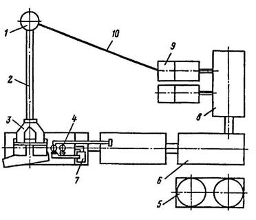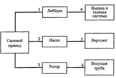 Рис. 6.13 Функциональная схема установки: 1, 2, 3 - трансмиссии; 4 - ведущая ветвь каната; 5 - манифольд высокого давления со стояком и шлангом; 6 - вкладыши ротора.