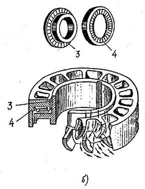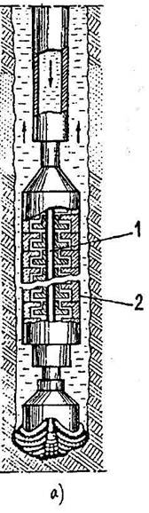 В качестве забойных двигателей при бурении используют турбобур, электробур и винтовой двигатель, устанавливаемые непосредственно над долотом. Турбобур (рис. 6.15) - это многоступенчатая турбина (число ступеней до 350), каждая ступень которой состоит из статора, жестко соединенного с корпусом турбобура, и ротора, укрепленного на валу турбобура. Поток жидкости, стекая с лопаток статора, натекает на лопатки ротора, отдавая часть своей энергии на создание вращательного момента, снова натекает на лопатки статора и т.д. Хотя каждая ступень турбобура развивает относительно небольшой момент, благодаря их большому количеству, суммарная мощность на валу турбобура оказывается достаточной, чтобы бурить самую твердую породу. При турбинном бурении в качестве рабочей используется промывочная жидкость, двигающаяся с поверхности земли по бурильной колонне к турбобуру. С валом турбобура жестко соединено долото. Оно вращается независимо от бурильной колонны. При бурении с помощью электробура питание электродвигателя осуществляется через кабель, укрепленный внутри бурильных труб. В этом случае вместе с долотом вращается лишь вал электродвигателя, а его корпус и бурильная колонна остаются неподвижными.