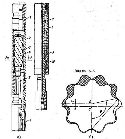 Рис. 6.16 Винтовой двигатель: а - общий вид; б - полости, образуемые между ротором (винтом) и статором; 1 - переводник; 2 - корпус двигательной секции; 3 - статор; 4 - ротор; 5 - карданный вал; 6 - корпус шпинделя; 7 - торцовый сальник; 8 - многорядный радиально-упорный подшипник; 9 - радиально резино- металлическая опора; 10 - вал шпинделя.