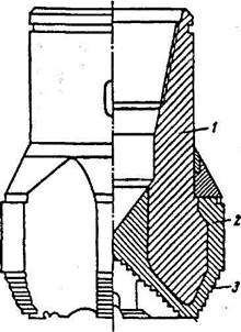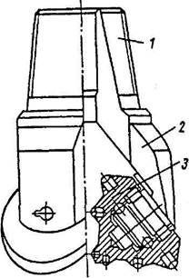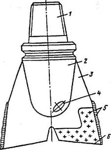 Основными элементами винтового двигателя (рис. 6.16) являются статор и ротор. Статор изготовлен нанесением специальной резины на внутреннюю поверхность стального корпуса. Внутренняя поверхность статора имеет вид многозаходной винтовой поверхности. А ротор изготовляют из стали в виде многозаходного винта. Количество винтовых линий на одну меньше, чем у статора. Ротор расположен в статоре с эксцентриситетом. Благодаря этому, а также вследствие разницы чисел заходов в винтовых линиях статора и ротора их контактирующие поверхности образуют ряд замкнутых полостей - шлюзов между камерами высокого давления у верхнего конца ротора и пониженного давления у нижнего. Шлюзы перекрывают свободный ток жидкости через двигатель, а самое главное - именно в них давление жидкости создает вращающий момент, передаваемый долоту. Инструмент, используемый при бурении, подразделяется на основной (долота) и вспомогательный (бурильные трубы, бурильные замки, центраторы). Как уже отмечалось, долота бывают лопастные, шарошечные, алмазные и твердосплавные. Лопастные долота (рис. 6.17) выпускаются трех типов: двухлопастные, трехлопастные и многолопастные. Под действием нагрузки на забой их лопасти врезаются в породу, а под влиянием вращающего момента - скалывают ее. В корпусе долота имеются отверстия, через которые жидкость из бурильной колонны направляется к забою скважины со скоростью не менее 80 м/с. Лопастные долота применяются при бурении в мягких высокопластичных горных породах с ограниченными окружными скоростями (обычно при роторном бурении). Шарошечные долота (рис. 6.18) выпускаются с одной, двумя, тремя, четырьмя и даже с шестью шарошками. Однако наибольшее распространение получили трехшарошечные долота. При вращении долота шарошки, перекатываясь по забою, совершают сложное вращательное движение со скольжением. При этом зубцы шарошек наносят удары по породе, дробят и скалывают ее. Шарошечные долота успешно применяются при вращательном бурении пород самых разнообразых физико-механических свойств. Изготавливают их из высококачественных сталей с последующей химико-термической обработкой наиболее ответственных и быстроизнашивающихся деталей, а сами зубки изготавливаются из твердого сплава. Алмазные долота (рис. 6.19) состоят из стального корпуса и алмазонесущей головки, выполненной из порошкообразной твердосплавной шихты. Центральная часть долота представляет собой вогнутую поверхность в форме конуса с каналами для промывочной жидкости, а периферийная зона - шаровую поверхность, переходящую на боковых сторонах в цилиндрическую.