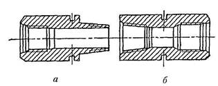 Наряду с обычными используют утяжеленные бурильные трубы (УБТ). Их назначением является создание нагрузки на долото и повышение устойчивости нижней части бурильной колонны. Ведущая труба предназначена для передачи вращения от ротора к бурильной колонне (роторное бурение) и передачи реактивного момента от бурильной колонны ротору (при бурении с забойным двигателем). Эта труба, как правило, имеет квадратное сечение и проходит через квадратное отверстие в роторе. Одним концом ведущая труба присоединяется к вертлюгу, а другим - к обычной бурильной трубе круглого сечения. Длина граней ведущей трубы определяет возможный интервал проходки скважины без наращивания инструмента. При малой длине ведущей трубы увеличивается число наращиваний и затраты времени на проводку скважины, а при большой - затрудняется их транспортировка. Бурильные замки предназначены для соединения труб. Замок состоит из замкового ниппеля (рис. 6.20 а) и замковой муфты (рис. 6.20 б). Непрерывная многозвенная система инструментов и оборудования, расположенная ниже вертлюга (ведущая труба, бурильные трубы с замками, забойный двигатель и долото) называется бурильной колонной. Ее вспомогательными элементами являются переводники различного назначения, протекторы, центраторы, стабилизаторы, калибраторы, наддолотные амортизаторы. Переводники служат для соединения в бурильной колонне элементов с резьбой различного профиля, с одноименными резьбовыми концами (резьба ниппельная-ниппельная, резьба муфтовая-муфтовая), для присоединения забойного двигателя и т.п. Но назначению переводники подразделяются на переходные, муфтовые и ниппельные. Протекторы предназначены для предохранения бурильных труб и соединительных замков от поверхностного износа, а обсадной колонны - от протирания при перемещении в ней бурильных труб. Обычно применяют протекторы с плотной посадкой, представляющие собой резиновое кольцо, надетое на бурильную колонну над замком. Наружный диаметр протектора превышает диаметр замка. Центраторы применяют для предупреждения искривления ствола при бурении скважины. Боковые элементы центратора касаются стенок скважины, обеспечивая соосность бурильной колонны с ней. Располагаются центраторы в колонне бурильных труб в местах предполагаемого изгиба. Наличие центраторов позволяет применять более высокие осевые нагрузки на долото. Стабилизаторы - это опорно-центрирующие элементы для сохранения жесткой соосности бурильной колонны в стволе скважины на протяжении некоторых, наиболее ответственных участков. От центраторов они отличаются большей длиной. Калибратор - разновидность породоразрушающего инструмента для обработки стенок скважины и сохранения номинального диаметра ее ствола в случае износа долота. В бурильной колонне калибратор размещают непосредственно над долотом. Он одновременно выполняет роль центратора и улучшает условия работы долота. Наддолотный амортизатор (забойный демпфер) устанавливают в бурильной колонне между долотом и утяжелен?шми бурильными трубами для гашения высокочастотных колебаний, возникающих при работе долота на забое скважины. Снижение вибрационных нагрузок приводит к увеличению ресурса бурильной колонны и долота. Различают демпфирующие устройства двух типов: амортизаторы-демпферы механического действ