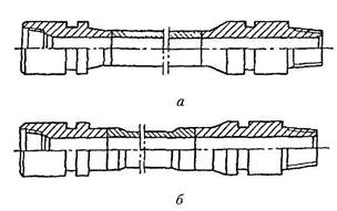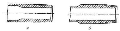 Алмазные долота бывают трех типов: спиральные, радиальные и ступенчатые. В спиральных алмазных долотах рабочая часть имеет спирали, оснащенные алмазами и промывочные отверстия. Долота этого типа предназначены для турбинного бурения малоабразивных и среднеабра-зивных пород. Радиальные алмазные долота имеют рабочую поверхность в виде радиальных выступов в форме сектора, оснащенных алмазами; между ними размещены промывочные каналы. Долота данного типа предназначены для бурения малоабразивных пород средней твердости и твердых пород как при роторном, так и при турбинном способах бурения. Ступенчатые алмазные долота имеют рабочую поверхность ступенчатой формы. Они применяются как при роторном, так и турбинном способах бурения при проходке малоабразивных мягких и средней твердости пород. Применение алмазных долот обеспечивает высокие скорости бурения, снижение кривизны скважин. Отсутствие опор качения и высокая износостойкость алмазов повышают их срок службы до 200...250 ч непрерывной работы. Благодаря этому сокращается число спуско-подъемных опреаций. Одним алмазным долотом можно пробурить столько же, сколько 15...20 шарошечными долотами. Твердосплавные долота отличаются от алмазных тем, что вместо алмазов они армированы сверхтвердыми сплавами. Бурильные трубы предназначены для передачи вращения долоту (при роторном бурении) и восприятия реактивного момента двигателя при бурении с забойными двигателями, создания нагрузки на долото, подачи бурового раствора на забой скважины для очистки его от разбуренной породы и охлаждения долота, подъема из скважины изношенного долота и спуска нового и т.п. Бурильные трубы отличаются повышенной толщиной стенки и, как правило, имеют коническую резьбу с обеих сторон. Трубы соединяются между собой с помощью бурильных замков (рис. 6.20). Для обеспечения прочности резьбовых соединений концы труб делают утолщенными. По способу изготовления трубы могут быть цельными (рис. 6.21) и с приварными соединительными концами (рис. 6.22). У цельных труб утолщение концов может быть обеспечено высадкой внутрь или наружу. При глубоком бурении используют стальные и легкосплавные бурильные трубы с номинальными диаметрами 60, 73, 89,102, 114, 127 и 140 мм. Толщина стенки труб составляет от 7 до 11 мм, а их длина 6, 8 и 11,5м.