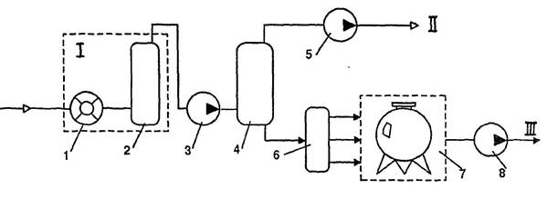 Рис. 9.1. Принципиальная технологическая схема ГПЗ: 1 - узел замера количества газа; 2 - установка очистки газа; 3 - компрессорная станция; 4 - отбензиниваюшие установки; 5 - компрессорная станция 2-й ступени; 6 - газофракциоиирующие установки; 7 - товарный парк; 8 - пункт отгрузки жидкой продукции. I - пункт приема газа; II - сухой газ потребителям; III - жидкая продукция потребителям