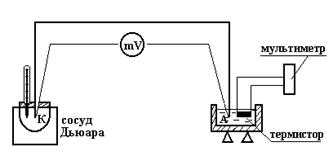 Определение температурной зависимости сопротивления полупроводника проводится для термистора - одного из самых простых полупроводниковых приборов. В полупроводниках электрическое сопротивление в значительной степени зависит от температуры. Зависимость сопротивления полупроводника от температуры в определенных температурных интервалах может быть описана выражением R=R 0 · exp(- D W/ 2 kT), где Т - абсолютная температура, k - постоянная Больцмана, DW - энергия активации полупроводника (термистора), exp - то же самое, что e - основание натурального логарифма. Таким образом, сопротивление полупроводника уменьшается по экспоненциальному закону. Зависимость сопротивления полупроводника (термистора) от температуры используется для измерения температуры по силе тока в цепи с полупроводником. Существуют термисторы для измерения как очень высоких (Т @ 1300 К), так и очень низких (Т @ 4-80 К) температур. В медицине широко применяются электротермометры, датчиком температуры в которых является термистор. К достоинствам электротермометров следует отнести их малую инерционность, высокую чувствительность, возможность изготовления малогабаритных датчиков, возможность измерения температур на расстоянии. К недостаткам относятся нелинейная шкала и старение. Термопары обладают меньшей чувствительностью, однако лишены указанных недостатков. Для определения температурной зависимости сопротивления термистора его вместе с активным термоспаем А фиксируют в дюралевом бруске. Для чего в бруске проделывается отверстие, заполняемое непроводящей жидкостью (масло, глицерин и т.д.). Термо-эдс термопары измеряют милливольтметром. Сопротивление исследуемого термистора определяют мультиметром. Контрольный термоспай К термопары опускают в сосуд Дьюара.