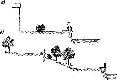 Городские набережные. В городах и населенных пунктах, расположенных на берегах рек, каналов, озер или морей, необходимо укреплять берега, а в некоторых случаях и архитектурно оформлять береговую линию. Укрепление берегов нужно для защиты их от подмыва рекой или морскими волнами, от размыва атмосферными и грунтовыми водами, от повреждения льдом, а также для предохранения грунта от сползания под воздействием тяжелого транспорта, движущегося по проездам вдоль набережных. Планировка и застройка прибрежных районов города требуютне только устойчивости грунта береговой полосы, но и придания линии берега определенного очертания в плане и профиле, а также архитектурного оформления набережной. Вдоль берегов водных пространств часто устраивают магистральные улицы, разбивают бульвары и парки. В этом случае к архитектурному оформлению береговой линии предъявляют особенно высокие требования. Набережные можно использовать и для причаливания судов, посадки и высадки пассажиров, а иногда и для погрузочно-разгрузочных работ. В этих случаях им придают необходимое очертание в плане и профиле, а также устраивают пристани, сходы и съезды. В некоторых случаях прибрежную полосу используют для устройства городских пляжей и спортивных водных станций, также требующих специального оборудования. Проектное очертание в плане береговой линии, соответствующей нормальному (меженному) горизонту воды в реке или водоеме, называют линией регулирования набережной. Линии регулирования определяют проектную ширину рек или каналов и контур берегов озер, морей и других водных пространств. Они должны быть увязаны с красными линиями застройки и планировкой проездов, площадей, зеленых насаждений, располагающихся на берегах. Для небольших рек и каналов линии регулирования желательно делать параллельными, чтобы ширина зеркала реки была примерно одинаковой. Для этого приходится прибегать к перепланировке береговой полосы, срезке и подсыпке берегов, а иногда и к выправлению русла. При проектировании набережных и, в частности, ограждающихихстенок необходимо учитывать существующие и перспективные подземные инженерные сети, а также специальные сооружения, например мосты, плотины, шлюзы и др. Простейшими способами укрепления берегов являются: создание растительного покрова, обкладка фашинами, устройство плетней, заполненных камнем, мощение и покрытие берегов бетонными плитками и др. Однако эти способы укрепления могут быть использованы в городах лишь в тех случаях, когда прилегающая к реке территория не используется для городской застройки, устройства проездов и т. п. В городских условиях целесообразно применять более совершенные способы укрепления берегов путем устройства ограждения набережных в виде бетонных или железобетонных подпорных или одевающих стенок. В некоторых случаях применяют более простые конструкции подпорных стенок: из каменной кладки, а также из дерева. Вид и конструкция ограждения набережных определяются рельефом берега и принятой планировкой застройки или проездов на берегах. В зависимости от рельефа берегов набережные могут быть одноярусными или многоярусными. Одноярусные набережные (рис.1, а)устраивают при высоте стенки над нормальным уровнем воды до 5…6 м. При большей высоте стенки набережных имеют неприятный вид и лучш