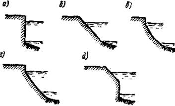 Рис.2. Виды очертания поверхностей подпорных стенок набережных По очертанию поверхностей, ограничивающих берег и омываемых водой, различают следующие виды набережных стенок: 1) вертикальные стенки (рис. 2, а); 2) пологие стенки прямолинейного (рис. 2, б), ломаного (рис. 2, в) или криволинейного (рис. 2, г) очертания; 3) стенки полуоткосного типа (рис.2, д) Очертание поверхности подпорных стенок набережных выбирают в зависимости от архитектурно-планировочных условий, а также в связи с геологическим строением и характером грунтов на берегах реки. Наклонное очертание поверхности подпорных стенок создает впечатление более широкой реки и в действительности увеличивает ширину зеркала воды в периоды паводков. Наклонное очертание поверхности стенок несколько улучшает также видимость с реки зданий построенных на набережных. Основной недостаток наклонного очертания заключается в том, что такие стенки занимают в плане довольно широкую полосу, отнимаемую ими за счет живого сечения реки или за счет ширины проездов вдоль набережных.