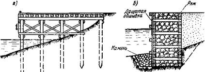 Рис.4. Деревянные ограждения набережных. Наружные стенки ряжа обшивают досками или пластинами. Кроме того, поверх обшивки прикрепляют горизонтальные брусья, предохраняющие ее от повреждения во время ледохода и в местах причала судов. Ряжи устанавливают на специально выровненную площадку и загружают камнем. Во избежание подмыва перед ряжем устраивают траншею, дно которой выкладывают крупным камнем, затем заполняют камнем или щебнем. Ограждение набережных деревянными эстакадными или ряжевыми конструкциями может быть выполнено из местных строительных материалов (дерево, камень) без рабочих высокой квалификации. Основные недостатки деревянных эстакадных набережных и ряжевых подпорных стенок следующие: грубый внешний вид и небольшой срок службы по сравнению с каменными, бетонными и железобетонными стенками. Поэтому деревянные ограждения набережных устраивают лишь в небольших городах, на загородных незастроенных участках, в индустриальных районах городов, если к набережным не предъявляются специальные архитектурные требования.