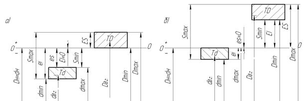 Схема полів допусків посадки з зазором у системі отвору (а) та вала (б) представлена на рис.11. Рис.11