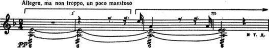«Жизнь» асафьевской формулы заключается в том, что «в процессе развертывания цепи интонаций происходит постоянное переключение (разрядка моя.— В. Б.) функций сочленов данной формулы»23. Покажем это на примере главной партии первой части Девятой симфонии Бетховена. Начальный импульс — квинта (i); далее начинается этап его развития (m); завершение (t) — начальный пятитакт собственно темы. Он же, в свою очередь, становится импульсом для всей темы главной партии, ее ядром:
