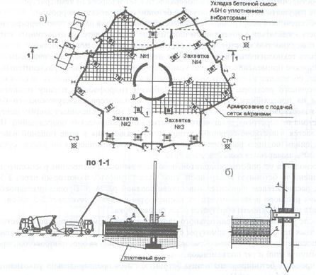 Рис. 9.4 Технология устройства перекрытий: а) устройство опалубки, армирование и бетонирование плит с разбивкой на захватки; б) схема инвентарной опалубки; 1 – колонна; 2 – воротник; 3 – инвентарная опалубка; 4 – стойки по периметру плиты; 5 – монолитная плита; 6 – виброрейка; 7 – автобетононасос; 8 – ядро жесткости