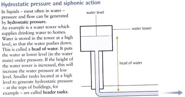 Exercise 2. Match the two parts to make correct sentences. Look at B opposite. 1. Header tanks are designed to a make liquid flow upwards from its surface. 2. To prime means b generate hydrostatic pressure in a building. 3. Siphonic action is able to c supply large numbers of buildings 4. Water towers are large tanks designed to d fill a pipe or hose to its full bore, removing the air.
