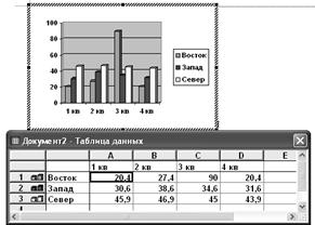 Рис. 23. Диалоговое окно Библиотека диаграмм Диаграмму можно вставить как объект программы Microsoft Excel. Из меню Вставка выбираем строку Рисунок и из выпадающего меню запускаем команду Диаграмма. Появляется таблица данных в формате программы Microsoft Excel и диаграмма, построенная по табличным данным (рис. 24). В таблицу можно внести свои данные, при этом диаграмма принимает вид в соответствии с новыми данными. Щелчком левой кнопки мыши вне области диаграммы она фиксируется. Чтобы вновь войти в режим редактирования, необходимо выполнить двойной щелчок левой кнопки мыши. При нажатии правой кнопки на области диаграммы появляется контекстное меню, в котором содержатся команды изменения свойств построенной диаграммы (Тип диаграммы, Параметры диаграммы, Режим таблицы и т. д.).