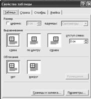 Рис. 32. Диалоговое окно Свойства таблицы Кнопка Границы и заливка открывает диалоговое окно Границы и заливка, в котором можно задать параметры границ для таблицы или для отдельной ячейки. Кнопка Параметры вкладки Таблица открывает окно Параметры таблицы, в котором устанавливаются поля ячеек по умолчанию. Вкладка Строка открывает новое диалоговое окно (рис. 33). В появившемся окне можно устанавливать высоту строки, используя поле со счетчиком. Здесь предусмотрен переход на предыдущую и последующую строки.