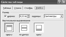 Рис. 33. Вкладка Строка Вкладка Столбец позволяет задать ширину столбца и единицы измерения. На вкладке Ячейка диалогового окна Свойство таблицы (рис. 34) можно изменять ширину ячейки, вертикальное выравнивание текста в выделенных ячейках. Для изменения поля в отдельных ячейках необходимо нажать кнопку Параметры, снять флажок Как во всей таблице и ввести новые значения полей.