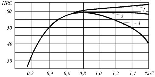 Рис. 4.5.3. Зависимость твёрдости мартенсита от содержания углерода в стали: 1 – закалка