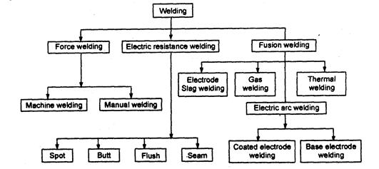 Welding is a permanent method for making joints. Welding has replaced riveting in many industries because of saving in labour as well as material and reduction in weight by the use of lighter plates and the elimination of all overlaps and rivets. Standard steel shapes, plates and bars may be welded together to make machine frame, bases, jigs and fixtures, etc. For joining of very high pressure steam pipes, welding is the only acceptable process. The aircraft, automotive and ship building industries have developed welding as a major fabricating method for aluminium magnesium and steel. Welding is defined as the localized, intimate union of metal parts in the plastic or plastic and molten state, with the application of blows or mechanical pressure or the union of parts in the molten state without any pressure. There are three main methods of welding, viz., forge welding, electric resistance welding and fusion welding, which may further be classified as shown in Fig. 4.33.