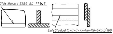 The example of T-Joint T1 is shown in fig.4.42 (a). It is weld without bevel edge, two-sided, with length of a leg weld 5 mm. The example of an interrupted lap welded joint H6 is shown in fig.4.42 (b). Width of a weld is 6 mm, length of a weld is 50 mm., pitch of a joint is 100 mm.
