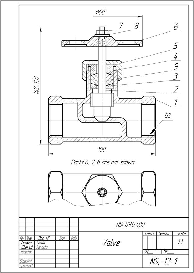 Assembly drawing shows how the components or parts must be assembled to form the complete machine or device. The assembly drawing shows the different parts in their relative positions. An assembly drawing furnishes the following information: a) One main view to show the best assembly. b) Selected overall dimensions and important centre to centre distance. c) Identification of different parts on assembly drawing. d) Necessary sectional views. e) Part list, notes, titles, etc. An assembly drawing is a document, which contains the representation of assembly unit and other information, necessary for its assembly and control. An assembly drawing must give the complete information about an article construction, interaction of parts, that belong to it, and there is a technical document during implementation of assembly operation and acceptance of an article. An assembly drawing must contain: А) representation of an assembly unit, which gives an idea of placing and interconnection of its separate parts; B) sizes and other parameters and requirements, which are carried out and controlled in the process of an assembly of an article, pointing about the method of connection of parts of an article; C) part number of component parts of an article; D) basic descriptions of an article; E) overall, setting dimension, conjunctive and reference dimensions (fig.7.1). 1. Necessary and sufficient amount of representations are determined thus, the external and internal elements of an article were fully exposed on an assembly drawing. 2. The scale of a drawing is determined depending on complication of an article and its sizes, a paper format is chosen according to State Standard 2.301-68. A frame and title block are drawn. 3. Overall rectangles or circles are marked for placing of representations and the axes of symmetry are drawn. 4. Necessary sectional views, sections, additional representations are drawn. If any sectional view is to be drawn, fix the position of the cutting plane and find out the parts through which cutting plane passes. Difficult parts are drawn simultaneously on all of representations of an article. 5. Other parts are drawn. 6. The executed drawing is checked up, the lines of visible and invisible contours are drawn, sectional views and sections are shaded. Change hatching directions in adjacent sectioned components. 7. Extension and dimension lines are drawn and size numbers are marked. 8. Part numbers of component parts of an assembly unit are marked. 9. A title block is filled in, technical requirements and technical description of an article is shown in case of necessity. If an article is designed in a shape of a symmetric figure, it is recommended to combine the half of view with the half of the proper sectional view. Fixing, keys, connecting rods, axles and shafts in a longitudinal section are drawn undissected. Such elements, as spokes of fly-wheels, pulleys, gear-wheels, thin walls as stiffening ribs are cut, but are drawn unshaded, if a cutting plane passes along an ax or a long side of such element. Shadings of one part in sectional views on different representations are drawn under one angle, maintaining the identical interval of shading. Shadings of contiguous parts are drawn in different directions.