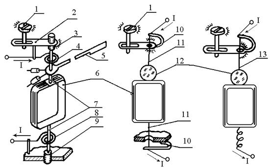 Рис. 6.7. Рухомі частини магнітоелектричного приладу: а ‑ на півосях; б ‑ на розтяжках; в ‑ на підвісі