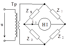 Порівняння зосереджених параметрів електричних кіл зі зразковими мірами реалізується за допомогою мостів: постійного струму при вимірюванні опору, змінного струму при вимірюванні ємностей і індуктивностей. При цьому принцип вимірювання одинаків: він зводиться до зрівноважування мостів. Тому розглянемо лише випадок мостів змінного струму. Найпростішим з них є чотириплечий міст. Він має 2 діагоналі (рис. 6.32): живлення (до ній підключена вторинна обмотка трансформатору) і індикаторного приладу (включений пристрій НІ). Міст вважається зрівноваженим, якщо струм І0 у вимірювальній діагоналі дорівнює нулю. Тоді відповідно до другого закону Кірхгофа