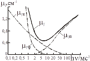Рисунок 3.8 – Графіки залежності макроскопічних січень фотопоглинання μγф, комптонівського розсіювання μ γк, утворення пар μ γп і повного коефіцієнта поглинання μ γ від енергії гамма-квантів в hν / mc 2 у свинцю Комптонівська взаємодія. Комптонівська взаємодія відбувається на електронах при енергіях гамма-квантів, які значно перевищують енергію зв’язку електронів на електронних орбітах. При цьому гамма-квант вступає в взаємодію з вільним або слабо зв’язаним електроном і в результаті непружного співудару з електроном передає останньому частину своєї енергії та імпульсу, а сам змінює своє направлення, набуває енергії, яка рівна (hn)/, і відхиляється під кутом Q до початкового напрямку. Електрон викидається з атома під кутом j / до напрямку падаючого гамма-кванту (Рис. 3.7,б). Із збільшенням енергії гамма-квантів кут їх відхилення від початкового напрямку закономірно зменшується. Коефіцієнт ослаблення γ-випромінювання за рахунок комптонівського розсіяння μ к визначається за формулою: