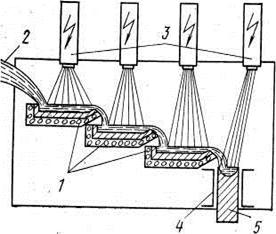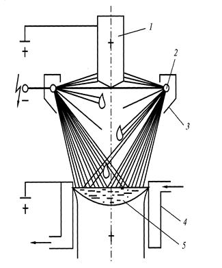 Рис. 2.30. Схема холодноподового рафинирования: 1 — водоохлаждаемые подовые секции; 2 — жидкий металл; 3 — пушки; 4 — водоохлаждаемый кристаллизатор; 5 — слиток 2.5.4. Технология ЭЛП.