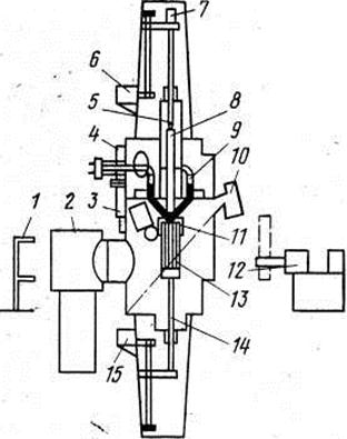 Рис. 2.27. Схема электронно-лучевой установки: 1 — площадка обслуживания; 2, 3 — вакуумные насосы; 4— камера; 5 — шток механизма подачи заготовки; 6 — привод механизма подачи; 7 — механизм вращения заготовки; 8 — заготовка; 9 — электроннолучевая пушка; 10—стробоскопическая смотровая система; 11—поворотный кристаллизатор; 12 — манипулятор; 13— слиток; 14 — шток механизма вытягивания слитка; 15 — привод механизма вытягивания.
