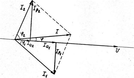 9. Для построения векторной диаграммы задаёмся масштабом по току и напряжению: I см - 2 А I см - 5 В Построение начинаем с вектора напряжения U. Под углом φ1, к нему (в сторону отставания) откладываем в масштабе вектор тока I1, под углом φ2 (в сторону отставания) - вектор тока - I2. Геометрическая сумма этих токов ровна току в неразветвленной части цепи.
