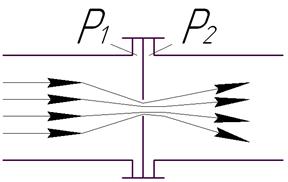 При протекании ж. ч/з диафрагму происходит сужение потока; при этом в пристеночном слое перед диафрагмой возникает турбулентное движение и повышается давление. Т.к. выпрямление струи за диафрагмой мгновенно не происходит, то в пристеночном слое возникает зона разряжения, тогда давление Р1>Р2. Расход ж. ч/з диафрагму определяется: