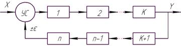 Рисунок 31 Звенья c 1 по k - линия прямого преобразования, звенья с k+1 по n - линия обратного преобразования. Если выходная величина n-го звена имеет знак «+», то обратная связь называется жёсткой положительной, если знак «-», то жёсткой отрицательной. Если выходная величина может принимать как «+» так и «-» значения, то обратная связь называется гибкой. Обозначим через