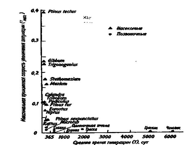 Рис. 6.1. Гиперболическая зависимость максимальной врожденной скорости увеличения популяции от времени генерации по Пианка, 1981