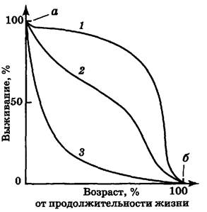 Динамика популяций — это процессы изменения ее основных биологических показателей (численности, биомассы, структуры) во времени в зависимости от экологических факторов. Жизнь популяции проявляется в ее динамике — одном из наиболее значимых биологических и экологических явлений. Кривые выживания. Кривая выживания представляет собой график зависимости от времени числа выживших на данный момент особей для некоторой начальной группы новорожденных. Каждому биологическому виду свойственна своя характерная кривая выживания (рис. 6.5).
