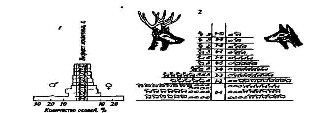 Рис. 6.6. Пирамида возрастов оленей (из Рамада, 1981): 1 —классическое изображение, 2— более сложное изображение с учетом погибших особей в каждом классе, символически представленных силуэтами черепов Рост популяции и кривые роста. Если при незначительной эмиграции и иммиграции рождаемость превышает смертность, то популяция будет расти. Рост популяции является непрерывным процессом, если в ней существуют все возрастные группы. Скорость роста популяции при отсутствии каких-либо экологических ограничений описывает дифференциальное уравнение